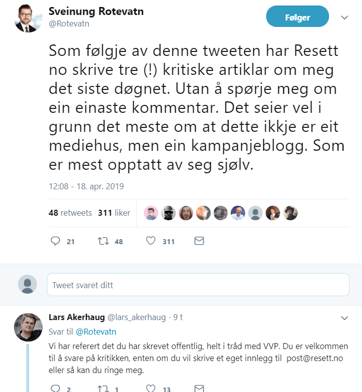 – Som følgje av denne tweeten har Resett no skrive tre (!) kritiske artiklar om meg det siste døgnet. Utan å spørje meg om ein einaste kommentar. Det seier vel i grunn det meste om at dette ikkje er eit mediehus, men ein kampanjeblogg. Som er mest opptatt av seg sjølv, twitret han.