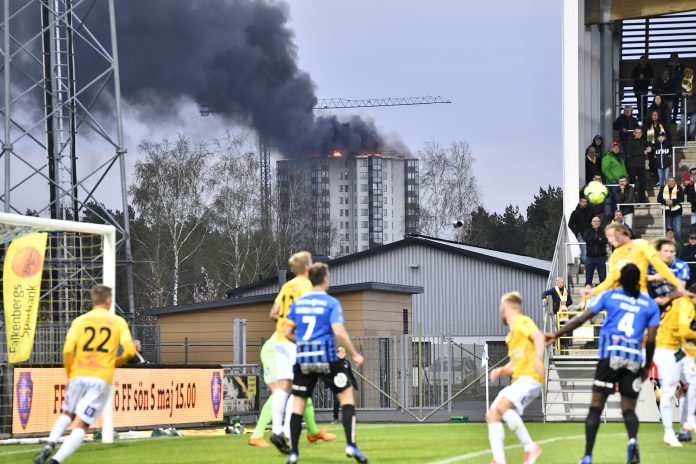 Onsdag kveld brøt det ut en voldsom brann i en nybygd leilighetsblokk i Falkenberg. Ingen personer skal ha vært i det 16 etasjer høye bygget, men brannen var torsdag ennå ikke slukket, ifølge Expressen.