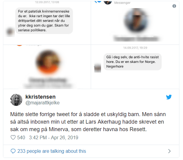 – Måtte slette forrige tweet for å sladde et uskyldig barn. Men sånn så altså inboxen min ut etter at Lars Akerhaug hadde skrevet en sak om meg på Minerva, som deretter havna hos Resett, skrev hun og la ved skjermbilder.