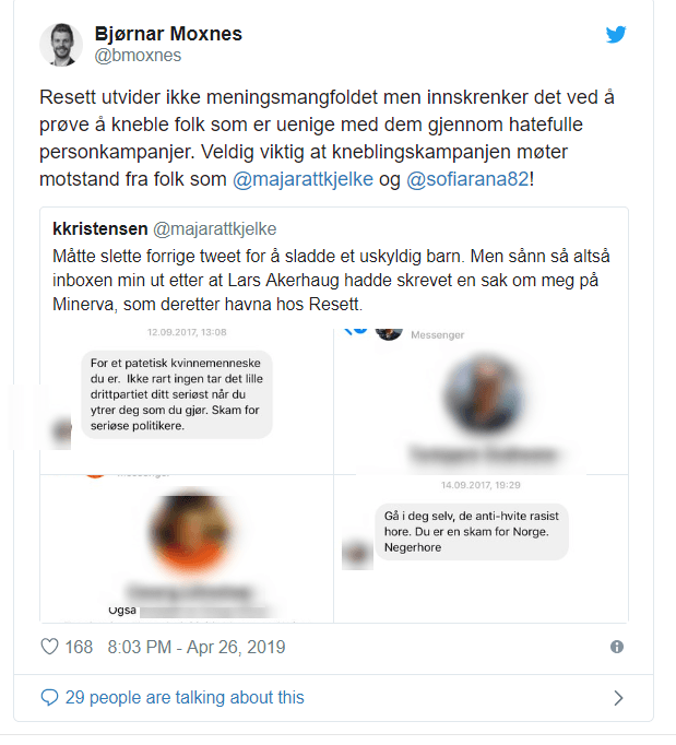 Hennes partileder Bjørnar Moxnes svarte på Twitter-meldingen, og knyttet Resett til Minervasaken og de hatefulle meldingene hun fikk.