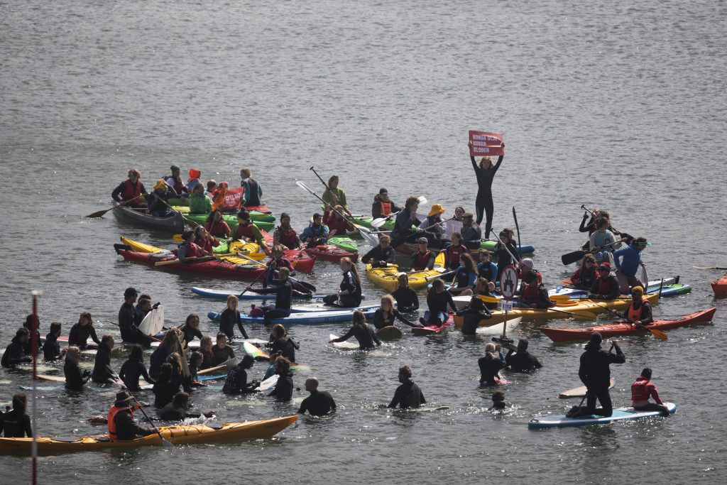Mange surfere padlet søndag ut i havnebassenget utenfor operaen i Oslo for å protestere mot Equinors oljeletingsplaner i Australbukta i Australia.