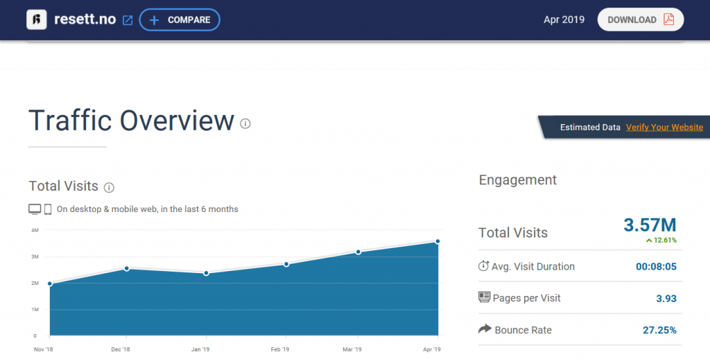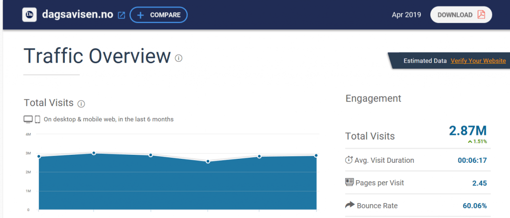For på de mest anerkjente firmaene som måler nettrafikk er allerede Resett større enn Dagsavisen. Det mest pålitelige regnes å være Similiarweb.com. For april målte Similarweb 2,87 millioner besøk (sesjoner) for Dagsavisen.no, mens de målte 3,57 millioner på Resett.no. Det vi kan si om det, er at Similarweb estimerer noe høyere tall for Resett enn det vi selv måler på Google Analytics, men det er et kjent trekk ved Similarweb og vi kan anta det gjelder for flere nettsider enn Resett. Det de stort sett får riktig uansett, er trender – går det opp eller ned. Og der kan vi sammenlikne Resett og Dagsavisen de siste 6 måneder.
