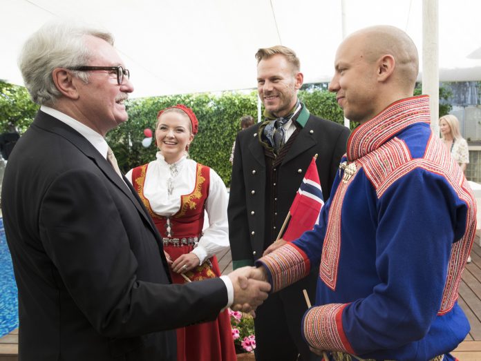 Buljo berømmer ambassadørens tale og synes det er flott at norske og samiske flagg står side om side ved ambassadørboligen.