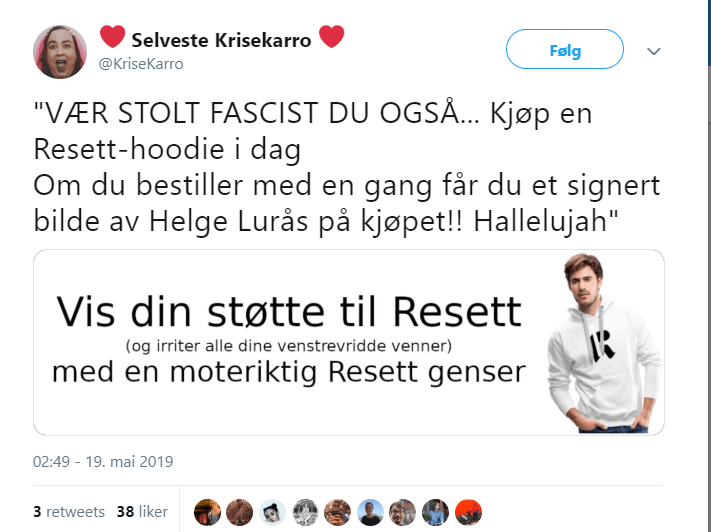 – «VÆR STOLT FASCIST DU OGSÅ… Kjøp en Resett-hoodie i dag. Om du bestiller med en gang får du et signert bilde av Helge Lurås på kjøpet!! Hallelujah, skriver en person som opplyset at hun er medlem i SV.