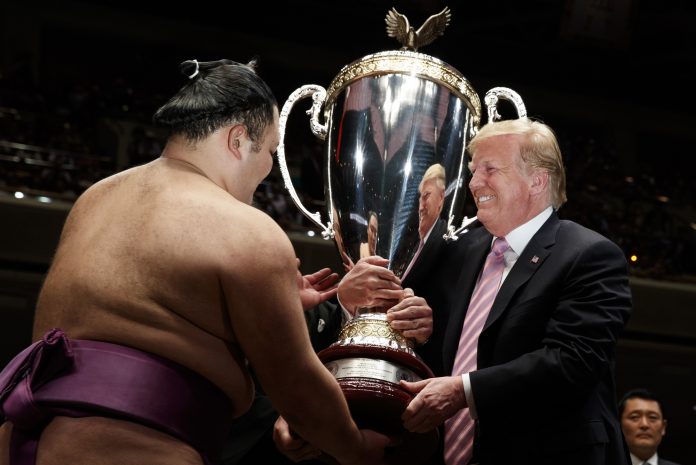 Seremonien fant sted etter en brytekamp som Trump og hans kone Melania fikk overvære sammen med Japans statsminister Shinzo Abe på et stadion i Tokyo.