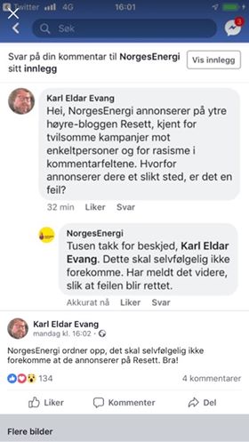 I forrige måned ble det kjent at NorgesEnergi fjernet annonser i Resett, etter at psykolog Karl Eldar Evang kontaktet selskapet og påstod at Resett sprer rasisme.