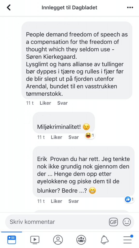 – Lysglimt og hans allianse av tullinger bør dyppes i tjære, rulles i fjær, før de blir slept ut på fjorden utenfor Arendal, bundet til en vasstrukken tømmerstokk, skrev en mann i kommentarfeltet.
