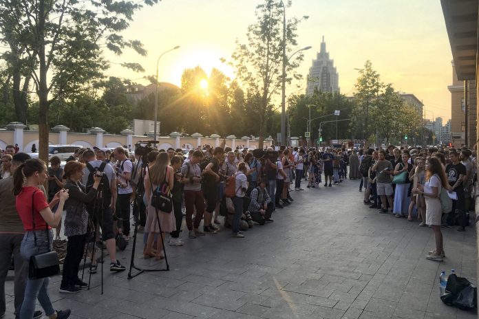 Mange journalister hadde lørdag samlet seg utenfor innenriksdepartementet i Moskva, og det har vært protester mot pågripelsen i både Moskva og St. Petersburg.