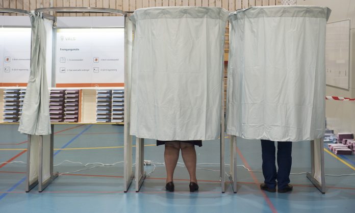 Statsminister Erna Solberg (H) og mannen Sindre Finnes er i Apeltunhallen i Bergen for å stemme ved kommunevalget. Foto: Marit Hommedal / NTB scanpix