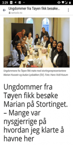Avisen Vårt Oslo laget gladsak da en gruppe hijabkledde ungdommer fra Tøyen fikk besøke stortingsrepresentant Marian Hussein (SV). Hussein er den første som har talt med hijab fra Stortingets talerstol.