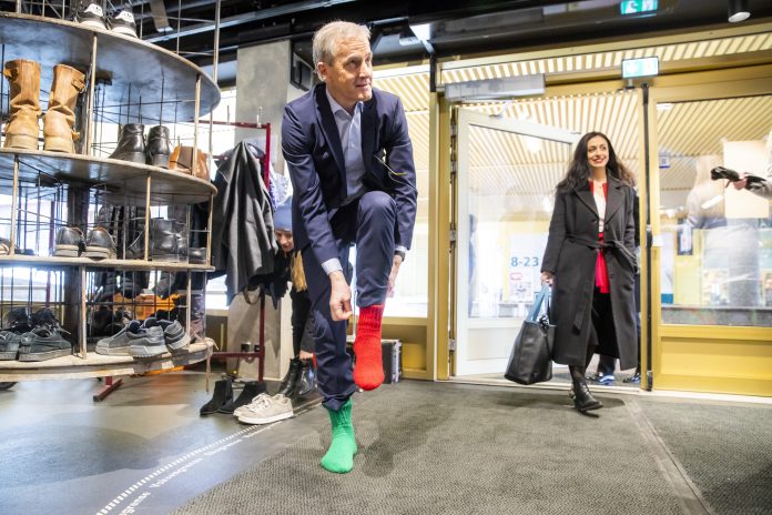 Leder Jonas Gahr Støre ikler seg sine røde og grønne raggsokker når han og nestleder Hadia Tajik ankommer Arbeiderpartiets pressekonferanse på Biblo Tøyen tirsdag - der det er skoforbud. Foto: Håkon Mosvold Larsen / NTB scanpix