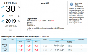 Dette er temperaturen i Trondheim natt til den 30. juni 2019, klokken 24-01. Det ble målt en maksimumstemperatur på 11,3 grader.