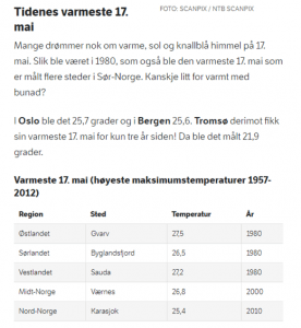 Varmeste 17. mai (høyeste maksimumstemperaturer for perioden 1957-2012)