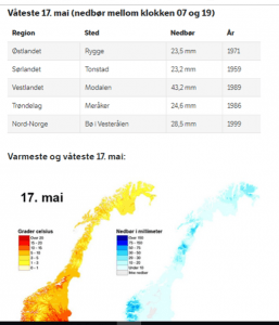 Når det gjelder den 17. mai med mest nedbør, så ser vi at de har kommet i perioden 1959-1999, avhengig av hvor i landet man ser.