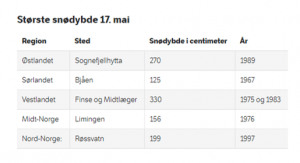Mest snø på 17. mai har man i Norge fått i perioden 1967-1997, hvor man på Vestlandet fikk nesten tre og en halv meter snø både i 1975 og i 1983.