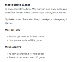 Men da må det vel ihvertfall være de mest solrike 17. mai dager vi har opplevd nå i senere tid da? Neida. De mest solrike nasjonaldager har vi hatt i 1973. Minst sol var det i 1979.