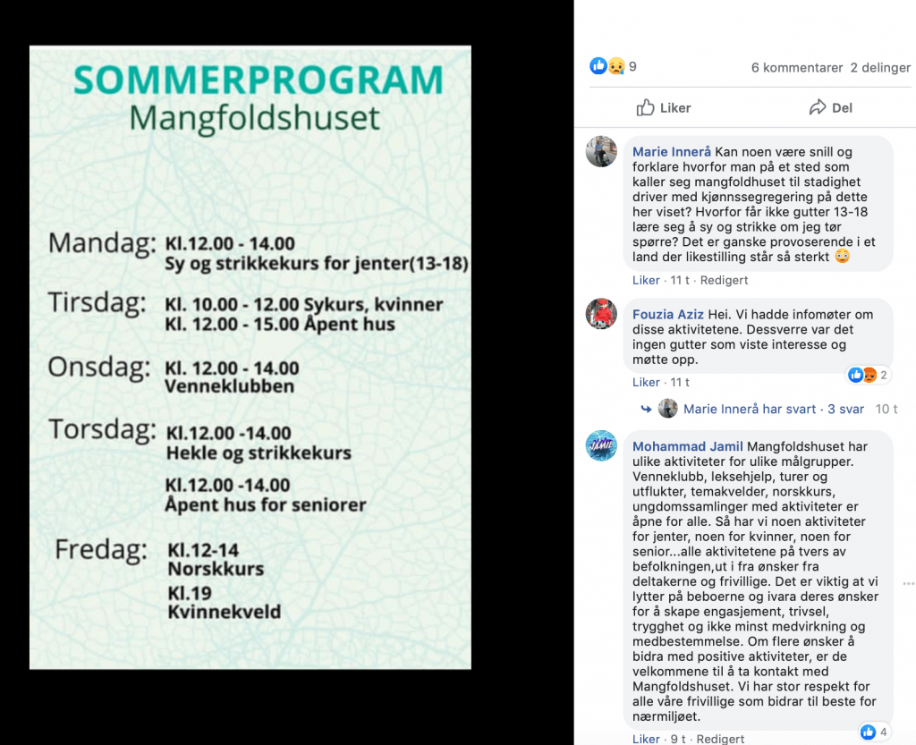 I et svar på denne posten skriver en Mohammad Jamil, som later til å være involvert ved Mangfoldshuset, at man har egne aktiviteter for jenter og kvinner, og at det er viktig å lytte til beboerne og «ivareta deres ønsker for å skape engasjement, trivsel, trygghet og ikke minst medvirkning og medbestemmelse».