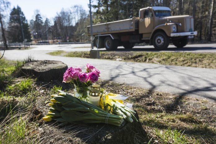 Det ble lagt ned blomster og lys på stedet der en kvinne ble påkjørt og drept i Lahelleveien i Sandefjord i april. Foto: Trond Reidar Teigen / NTB scanpix