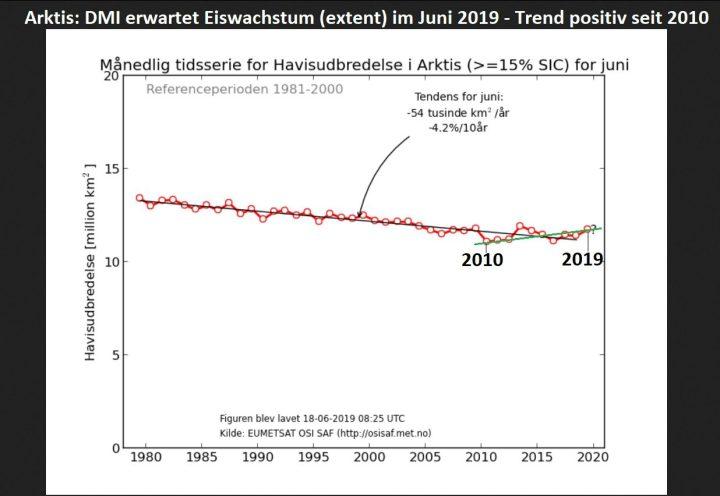 De har for få data foreløbig for Nordpolen, men det har nylig kommet frem at man aner større sykliske fenomener. Trenden det siste tiåret ser ut til å være reversert, som i denne grafen fra Dansk Meteorologisk Institutt: