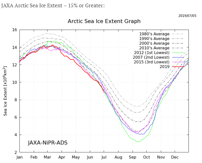 På dagens oversikt fra JAXA ser vi at 2012 hadde lavest isutbredelse, fulgt av 2007 og 2015. Vi ser også en nedaggående trend, så det er kanskje naturlig at forskerne trekker linja ned mot null?