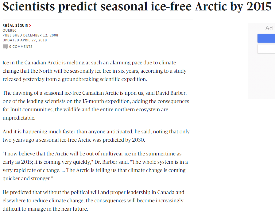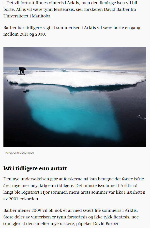 8. desember i 2008 slo Adresseavisen bombastisk fast: «-Arktis blir isfritt om sju år[.] Global oppvarming vil føre til at Arktis vil være fri for sommeris senest i 2015.» (Pauker: Dann-da-rann-dann-dann!)