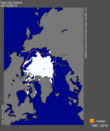 Her ser vi en illustrasjon av isutbredelsen i august 2015. Det hvite området viser altså området med mellom 15 og 100% is på vannet: