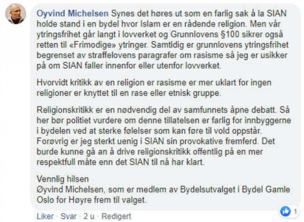 Øyvind Michelsen, som sitter i bydelsutvalget for Høyre, mener det kan være farlig å la SIAN demonstrere i et område med mange muslimer.