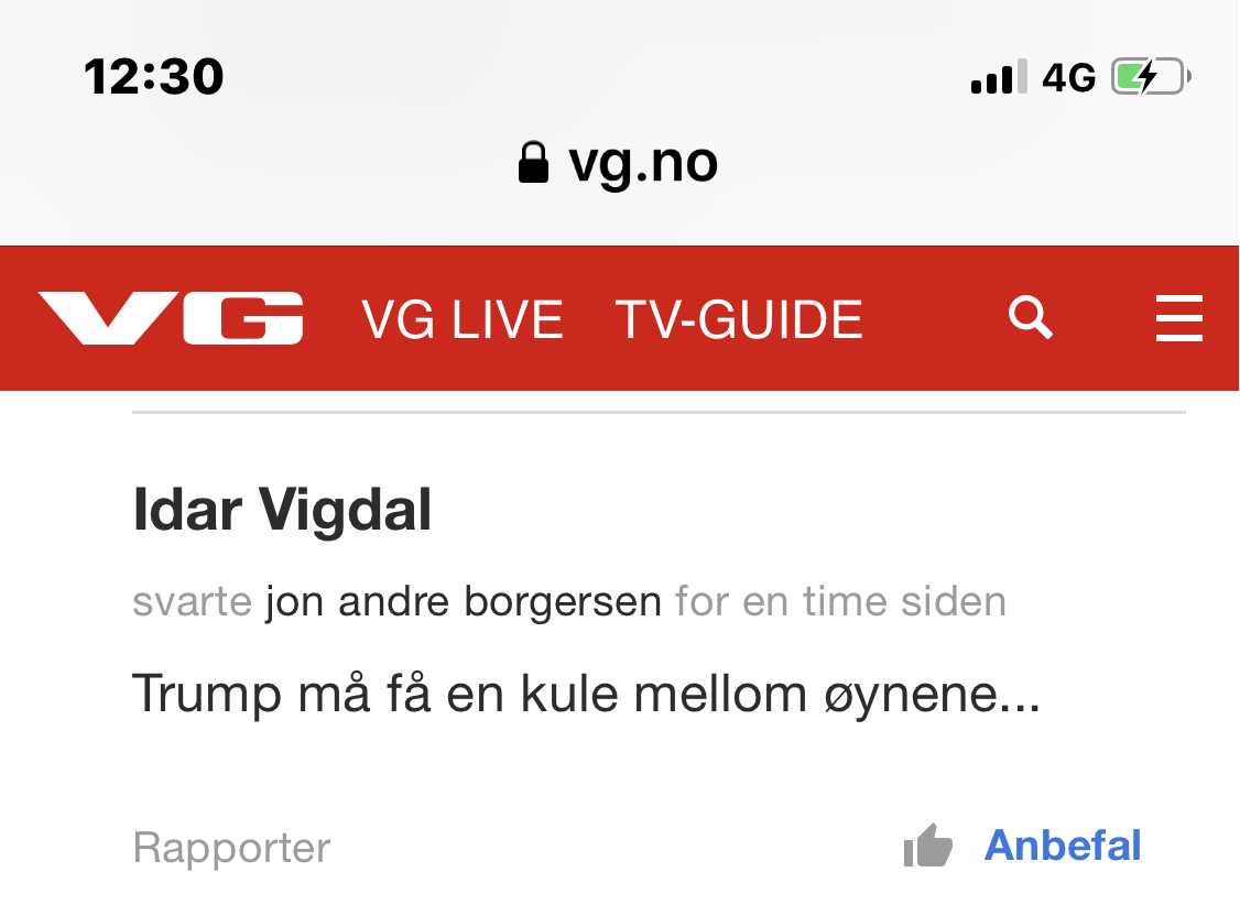 Kommentaren er hentet fra VG i en negativ vinklet Trump-sak i kommentarfeltet. Drapstrusselen fikk stå i flere timer uten at VG har fjernet kommentaren.