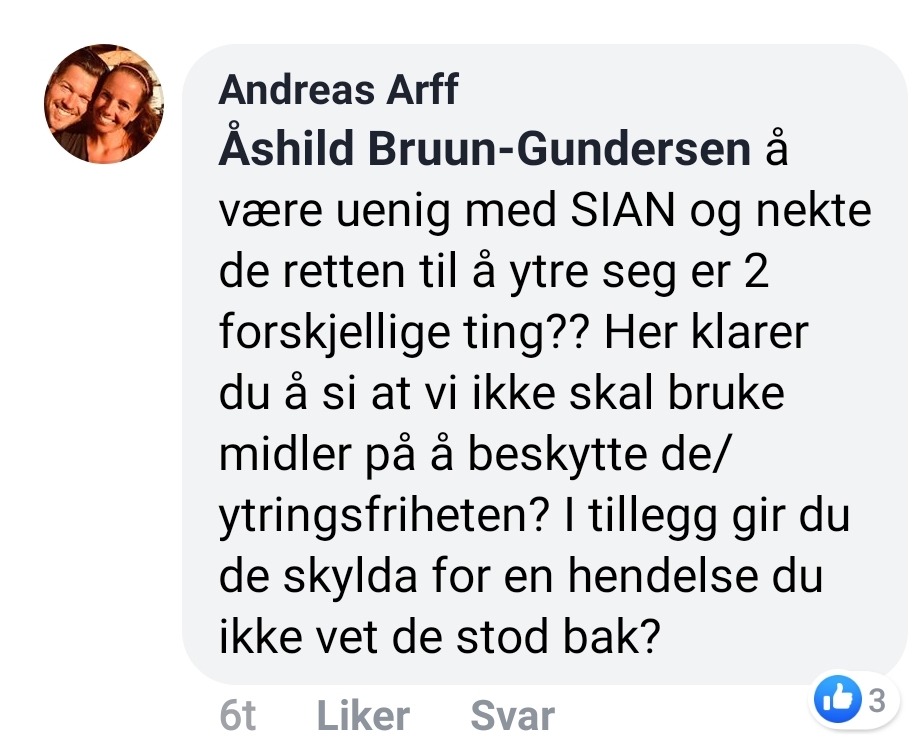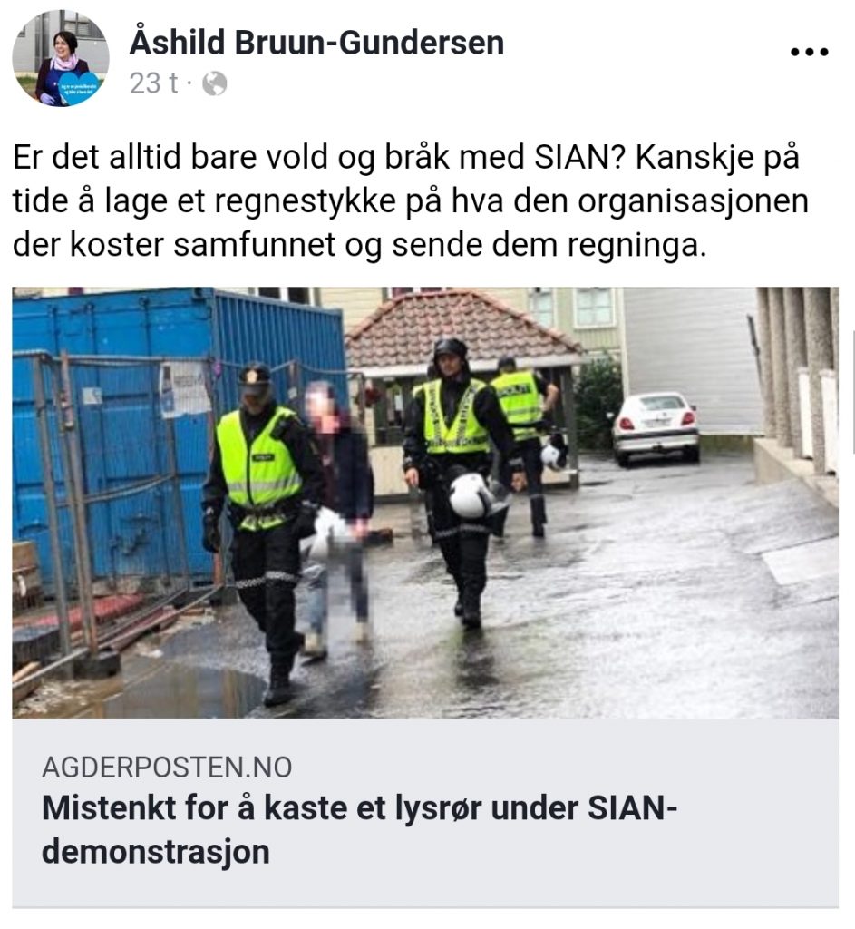 – Er det alltid bare vold og bråk med SIAN? Kanskje på tide å lage et regnestykke på hva den organisasjonen der koster samfunnet og sende dem regningen? skrev Bruun-Gundersen, da hun først delte den aktuelle artikkelen fra Agderposten.