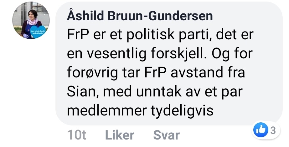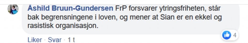 Stortingsrepresentant Åshild Bruun-Gundersen fra Frp skrev nylig på Facebook at Frp mener at «SIAN er en ekkel og rasistisk organisasjon», noe som møtte både motbør og støtte fra hennes partikollegaer i det aktuelle kommentarfeltet.