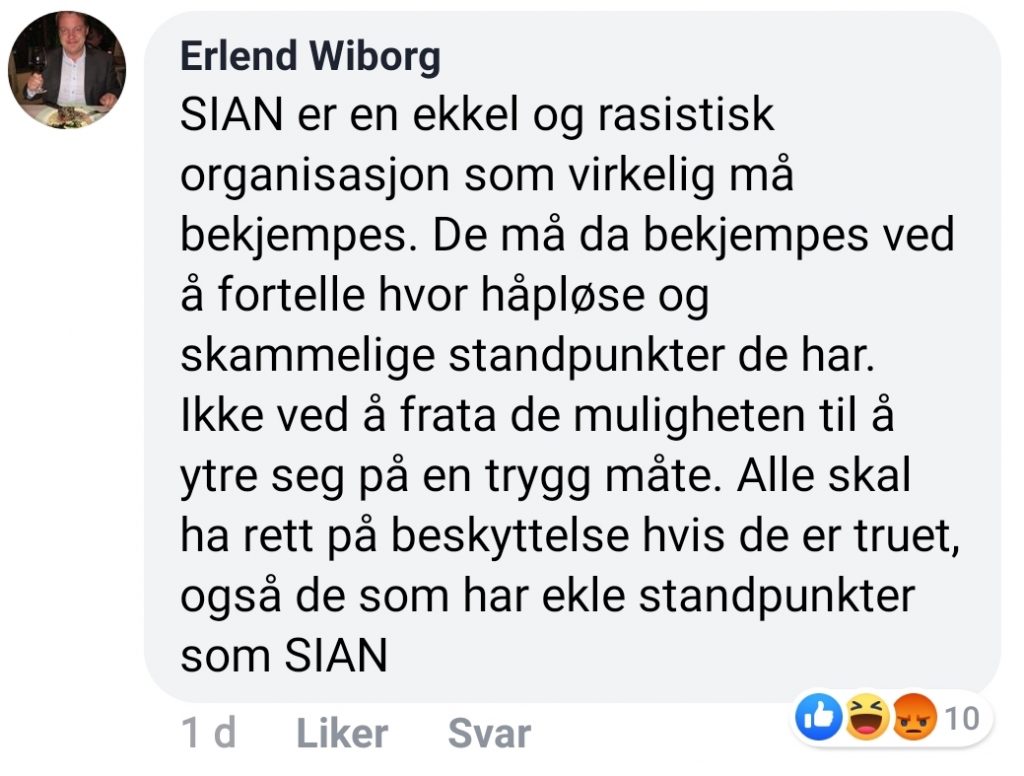 – SIAN er en ekkel og rasistisk organisasjon som virkelig må bekjempes ved å fortelle hvor håpløse og skammelige standpunkter de har. Ikke ved å frata dem muligheten til å ytre seg på en trygg måte. Alle skal ha rett på beskyttelse hvis de er truet, også de som har ekle standpunkter som SIAN, skriver Wiborg.
