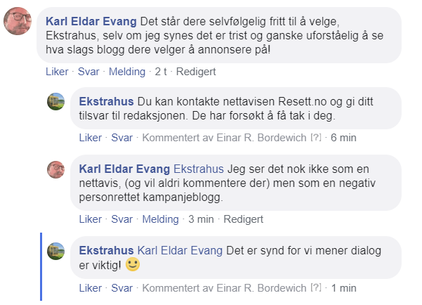 – Hei. Ser at en annonse for Ekstrahus dukker opp på ytre-høyre-bloggen Resett, kjent for tvilsomme personrettede kampanjer og rasisme i kommentarfeltet. Kan det være en feil? Svært mange andre annonsører har reservert seg mot nettopp Resett, så det er en mulighet, skrev Evang til Ekstrahus.