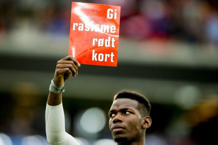 Paul Pogba holder oppe et «Gi rasisme rød kort»-kort før treningskampen i fotball mellom Vålerenga og Manchester United på Ullevaal stadion i 2017. Foto: Vegard Wivestad Grøtt / NTB scanpix
