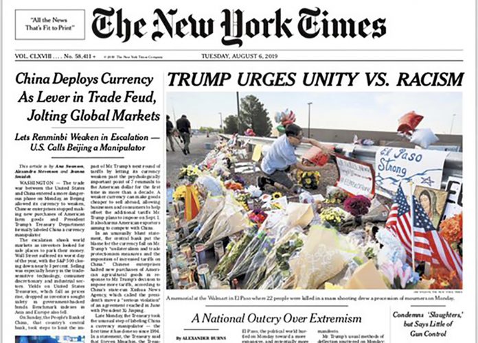 Tomorrow’s @nytimes tonight, second edition: @realDonaldTrump assails hate but not guns; China employs currency in trade feud, jolting markets. #nytimes pic.twitter.com/1fD4pVEbaF