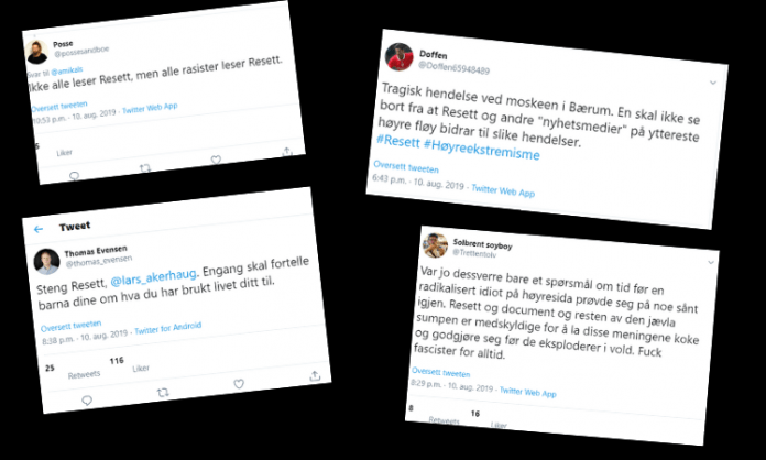 – Tragisk hendelse ved moskeen i Bærum. En skal ikke se bort fra at Resett og andre «nyhetsmedier» på yttereste høyre fløy bidrar til slike hendelser. #Resett #Høyreekstremisme, skriver en person.