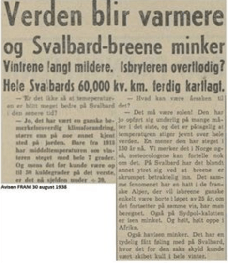 …Jeg la selv merke til adskillige forandringer på Svalbard. Fjorder og sund som det var umulig å komme inn i på grunn drivisen, er nu helt isfrie – Hornsund, Bellsund, Isfjord for eksempel. Et par av mine reisekamerater drog på en lengere rundtur hvor de konstaterte isfritt vann de fleste steder.