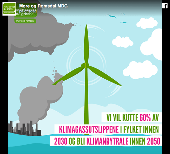 «Frem mot valget vil vi legge ut en rekke bilder av våre valgløfter, hvor vi forteller dere hva våre representanter lover å jobbe for i Møre og Romsdal etter valget 🤓🌎 Her er vårt første: Vi vil kutte utslipp! Nok grønnvasking, nå er det ekte, grønn politikk som gjelder 💪🌿 Lik og del!»