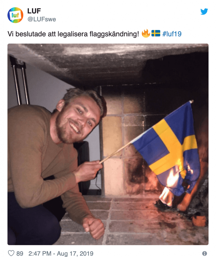 Det er beslutningen om å legalisere skjending av det svenske flagget som har skapt mest oppmerksomhet. For å markere beslutningen la ungdomspartiet ut et innlegg på Twitter av et av sine medlemmer, i det han brenner det svenske flagget, med et stort glis om leppene.
