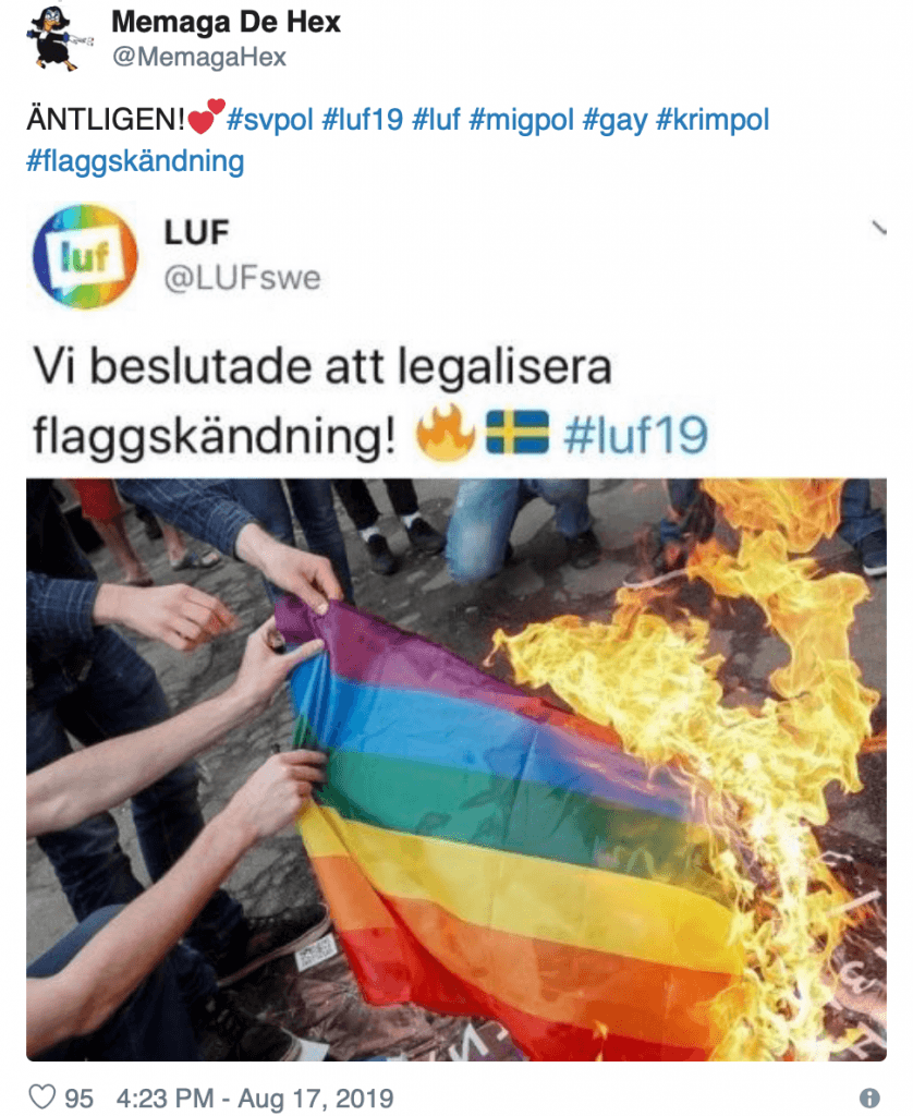 Det svenske partiet Liberalernas ungdomsparti LUF har på sin offisielle Twitter-konto publisert et bilde der man med et stort smil om munnen brenner det svenske flagget.