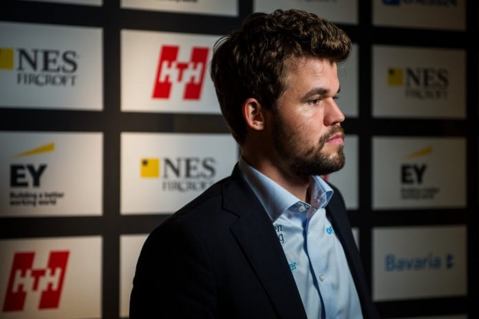 Magnus Carlsen slo sammenlagttoer Shakhriyar Mamedyarov med hvite brikker i den niende runden av den prestisjetunge sjakkturneringen i Nederland tirsdag.