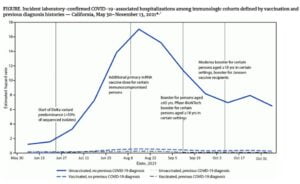 Tittelen på rapporten er COVID-19 Cases and Hospitalizations by COVID-19 Vaccination Status and Previous COVID-19 Diagnosis — California and New York, May–November 2021