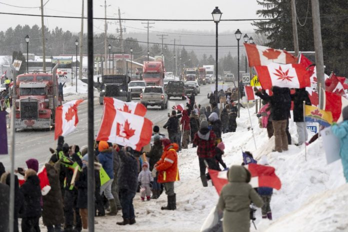 Kolonner med lastebiler på vei til protestmøte mot vaksinekrav ble møtt med flagg og plakater i Toronto.