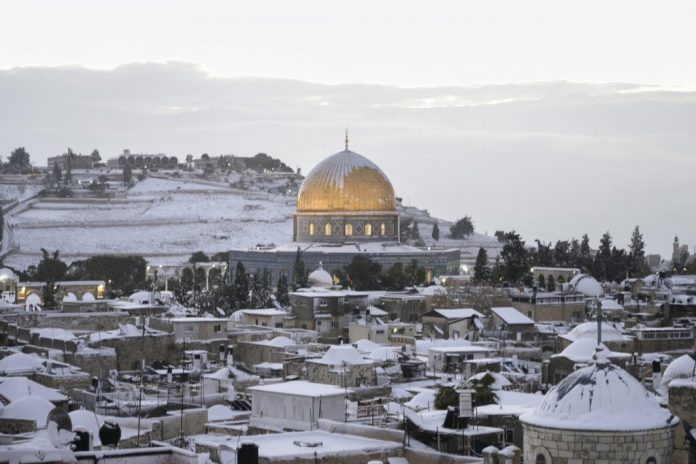 I Jerusalem utkjempet barna snøballkrig, og i løpet av dagen var Klippedomen og Al. Aqsa-moskeen dekket av et hvitt snølag.