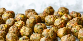 Spaghetti med pesto, tomat og kjøttboller av salsiccia