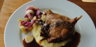 Andelårconfit med løk- og eplekompott, rødvinssaus