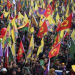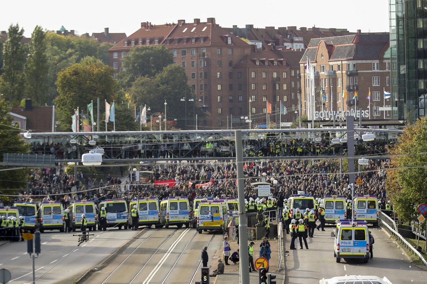 Demonstranter från Nordiska motståndsrörelsens (NMR) med sköldar, och fanor vid demonstrationen i centrala Göteborg på lördagen.