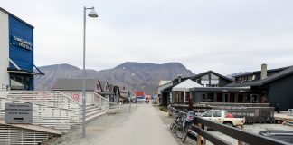 Isbjørn på vei tilbake til hytteområde på Svalbard
